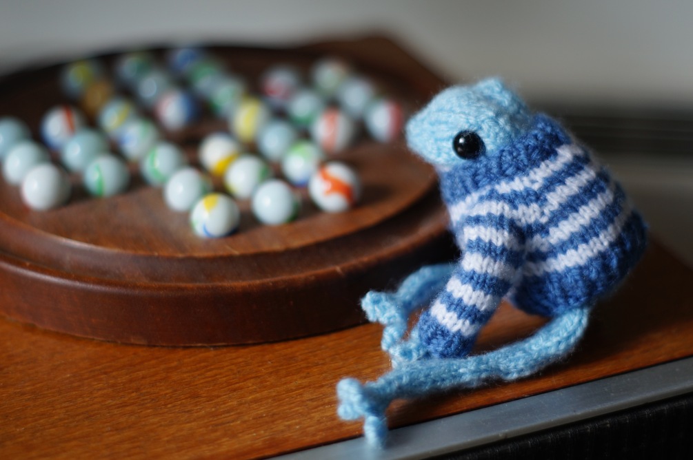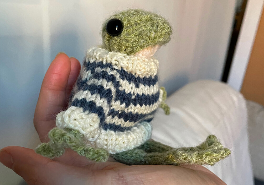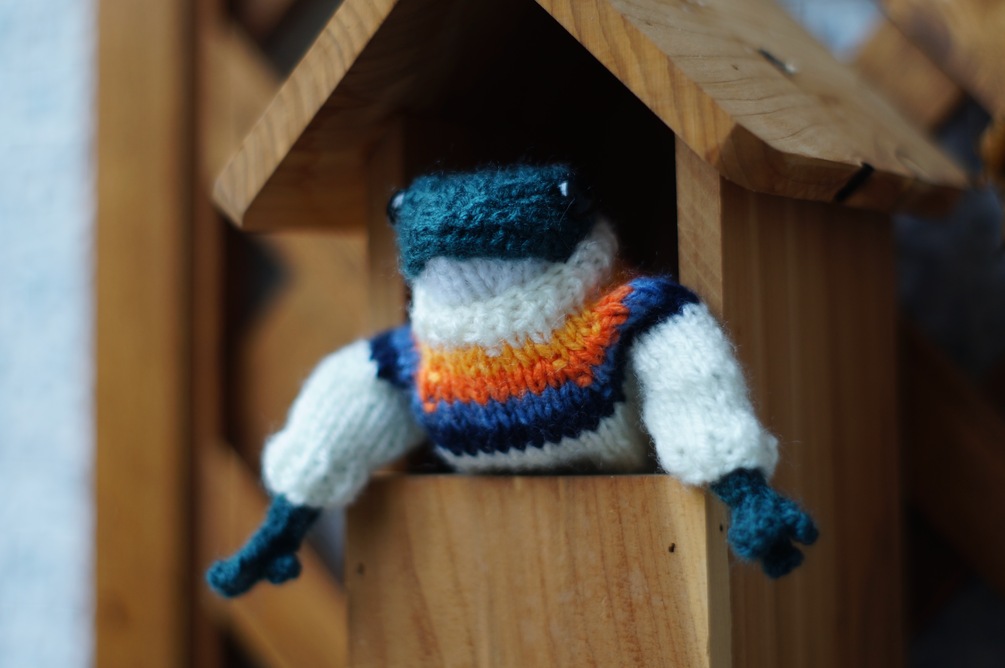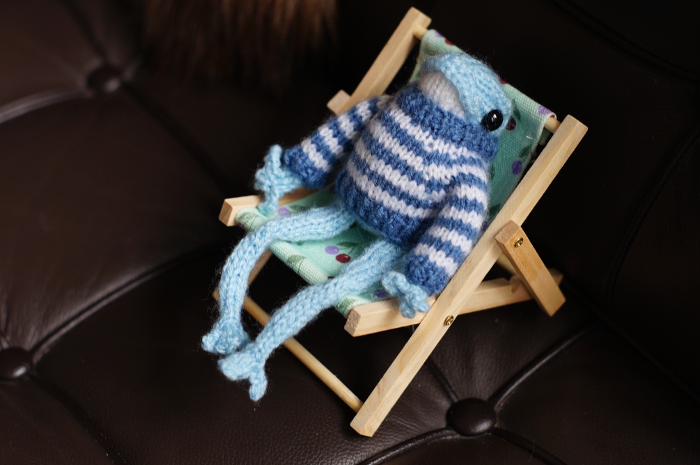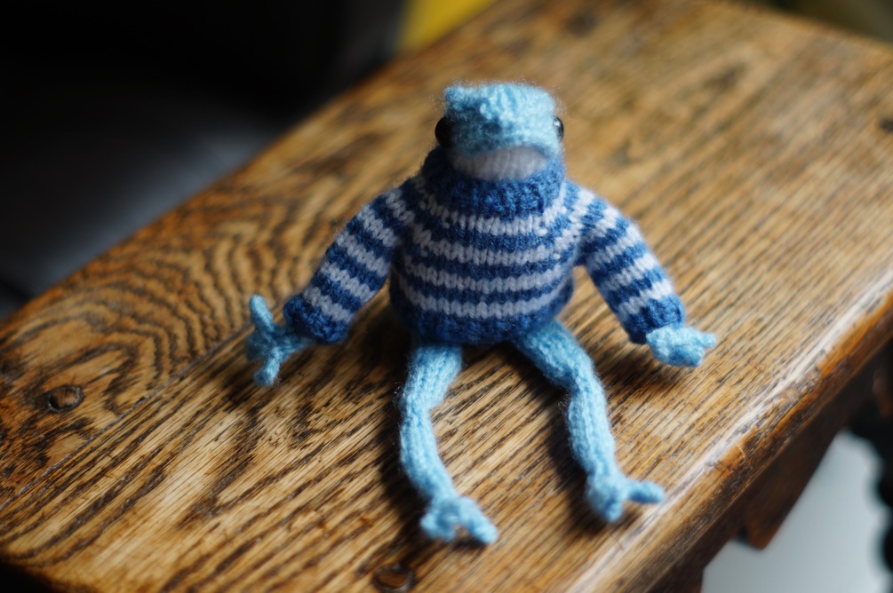 Each of these frogs I have individually knitted by hand over many hours using a mix of synthetic and pure wool. I have also knit each of them their own individual jumper (which obviously is important for the frogs in the colder seasons).